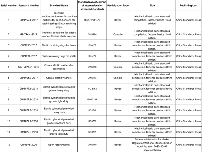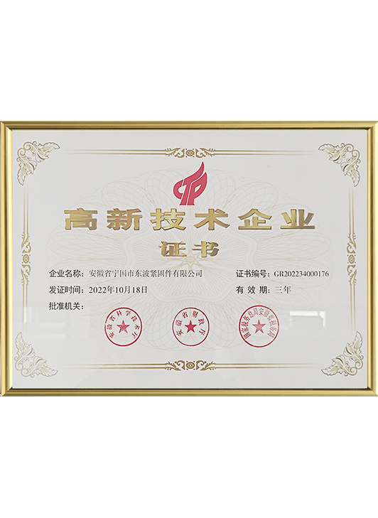 Dongbo Company har fungerat som enhetsmedlem i den nationella tekniska kommittén för standardisering av Fästelement i många år och var värd för det fjärde årsmötet för det femte nationella tekniska Kommittén för standardisering av fästelementen 2015. Det har successivt lett eller deltog i formuleringen och revisionen av 13 nationella standarder inklusive tekniska Förhållanden för elastiska fästringar, Elastiska cylindriska stift och skivbrickor.